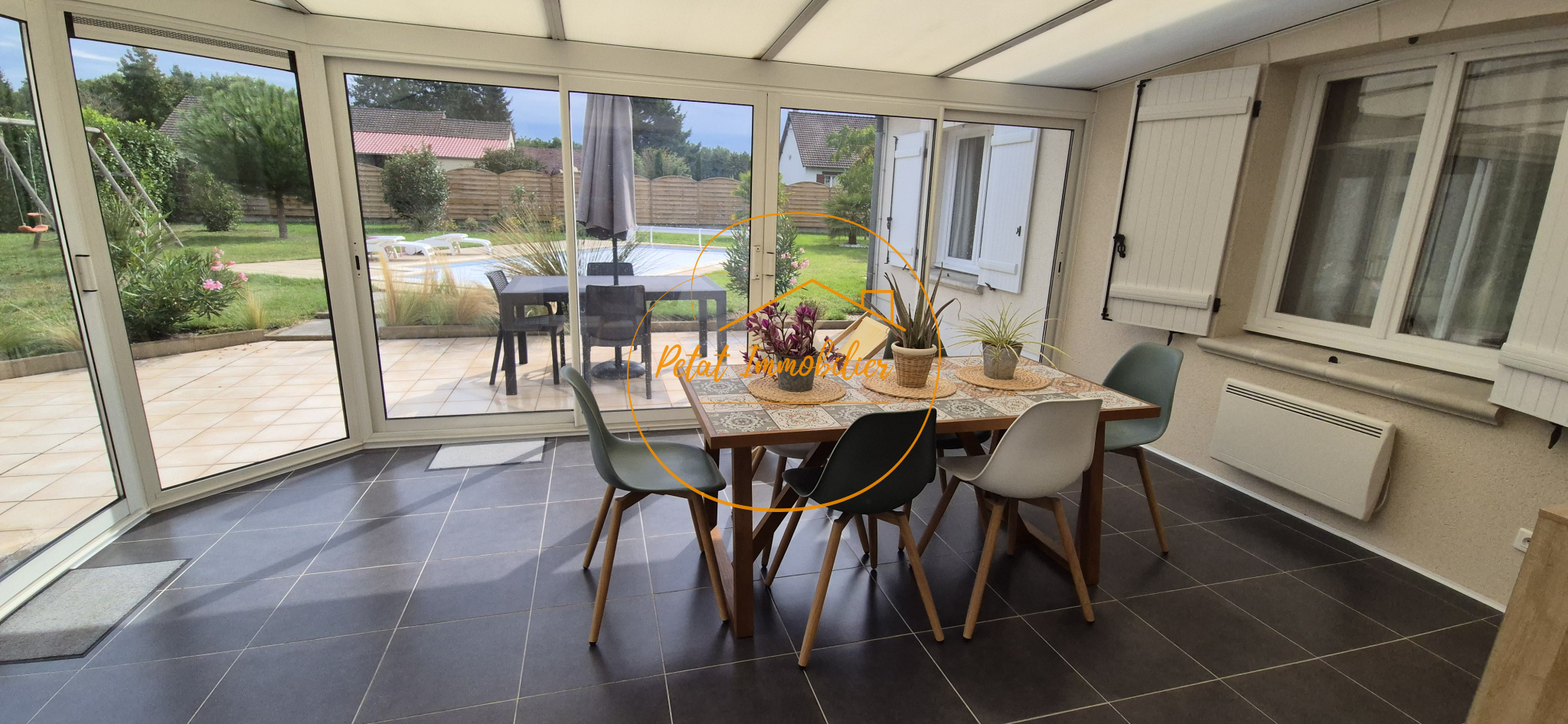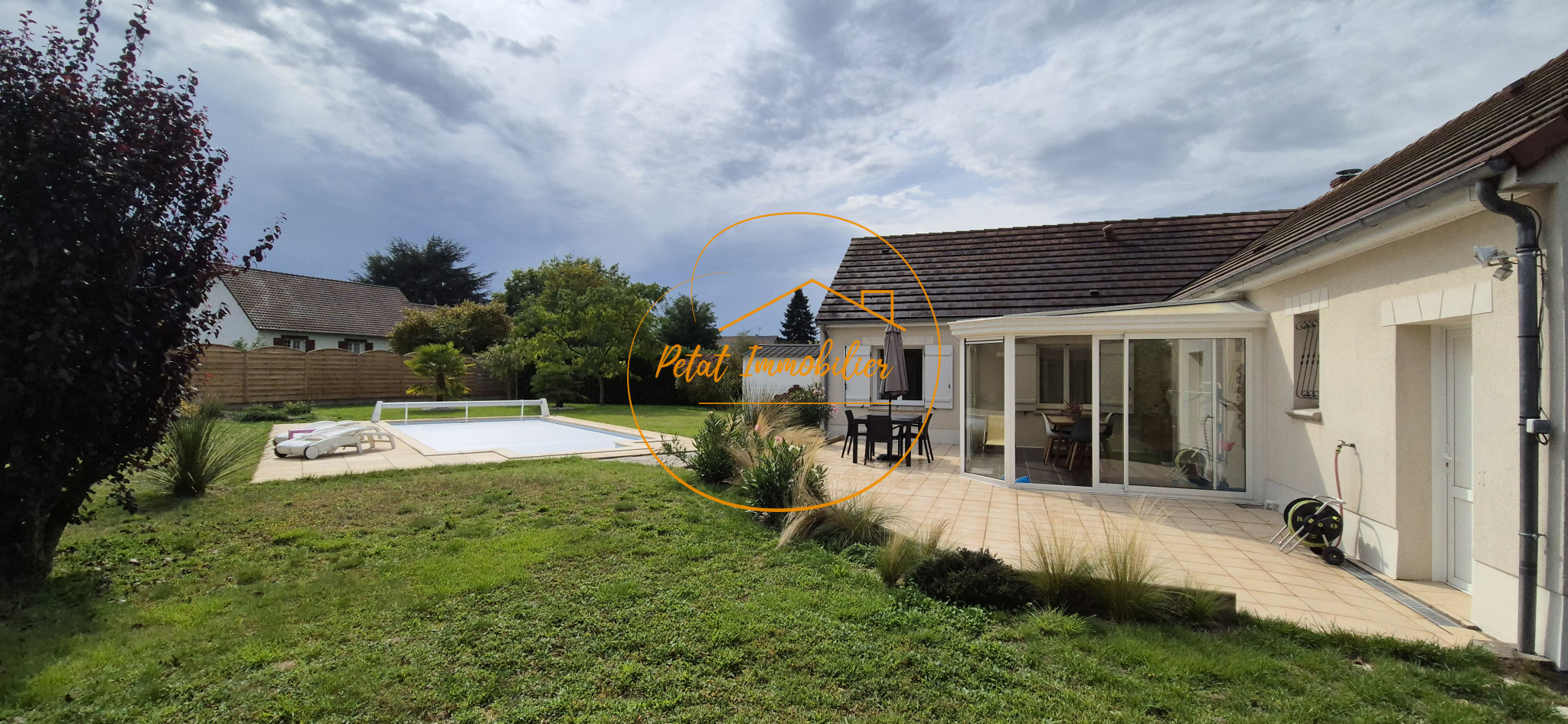L’extérieur est soigné : jardin arboré et paysagé de 2 414 m² orienté au sud, avec piscine chauffée de 4 x 8 mètres apportant un réel confort estival.